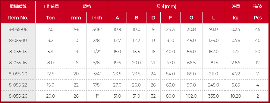 產品特性:適用於80級合金鋼鏈及鋼絲繩鉤子旁邊設計有個牛角可加強荷重,並且可讓鏈條平穩放入應用縮短或鉤住長鏈條通過狹窄間隙,卡槽達到和鏈條咬合防止滑落插銷開口的設計確保正確鏈條尺寸的使用,省去連接鏈條時活動鏈接的使用產品上面印製吊裝載荷量,PASAK和WLL的浮雕標誌材質