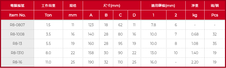 產品特性:設計用於80級合金鋼鏈及鋼絲繩連接的起吊點精心設計為一體成形無焊接口,並且扁平易於連接方便產品上面印製吊裝載荷量,PASAK和WLL的浮雕標誌材質:高強度鍛造合金鋼結構:熱處理高溫處理(淬火,回火)安全係數:5:1