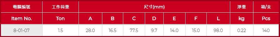 產品特性:適用於80級合金鋼鏈及鋼絲繩,特色是嘴寬且細貨鉤小巧便於勾起口徑小的貨物,且承受拉力相對強大產品上面印製吊裝載荷量,PASAK和WLL的浮雕標誌材質:高強度鍛造合金鋼結構:熱處理高溫處理(淬火,回火)安全係數:4:1